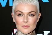 Serinda Swan Platinum Blonde Pixie Cut with Layered Bangs